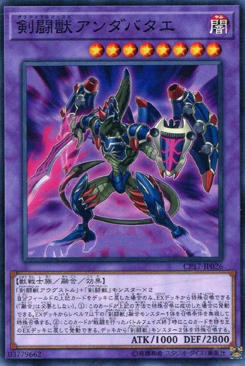 「劍鬥獸奧古斯都」+「劍鬥獸」之名的怪獸×2僅能將我方場上的上述卡片返回牌組才能從額外牌組特殊召喚(不需要「融合」)。(1):此卡以上述方法特殊召喚成功的場合可以發動。從額外牌組將1體等級7以下的「劍鬥獸」之名的融合怪獸無視召喚條件特殊召喚。(2):此卡進行戰鬥的戰鬥階段結束時可以將此卡返回持有者額外牌組發動。從牌組將2體「劍鬥獸」之名的怪獸特殊召喚。