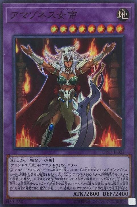 「亞馬遜女王」+「亞馬遜」之名的怪獸(1):此卡於怪獸區域存在為限,此卡以外的我方場上所有「亞馬遜」之名的卡片不會被戰鬥、卡片效果破壞。(2):我方的「亞馬遜」之名的怪獸向守備表示怪獸進行攻擊的場合,給予對手該攻擊力超過守備力數值的戰鬥傷害。(3):融合召喚出場的此卡被戰鬥破壞的場合或是因對手的卡片效果離場的場合可以發動。從我方手札、牌組、墓地選擇1體「亞馬遜女王」特殊召喚。