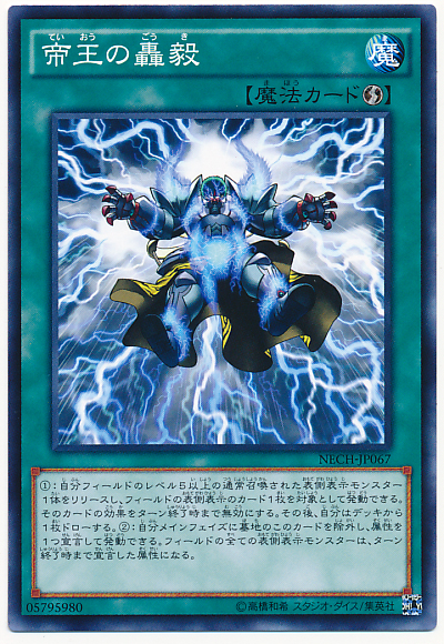 (1)解放我方場上1體表側表示以通常召喚的方式出場等級5以上的怪獸,選擇場上1張表側表示的卡片來發動。到回合結束時為止選擇的卡片的效果無效。之後,我方抽1張牌。 (2)我方主要階段時,可以移除墓地的此卡,宣言1個屬性來發動。到回合結束時為止場上表側表示現存的怪獸變為宣言的屬性。