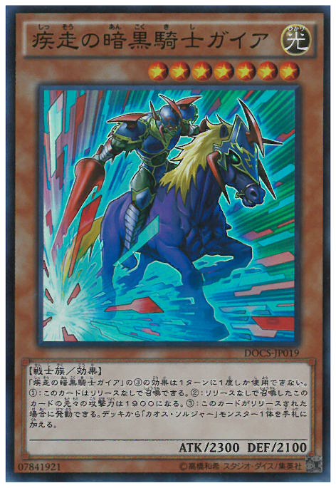 「疾走的暗黑騎士蓋亞」的(3)效果1回合僅能使用1次。 (1): 此卡可以不解放怪獸進行召喚。 (2): 不解放怪獸召喚出場的此卡的原攻擊力變為1900。 (3): 此卡被解放的場合可以發動。 從牌組將1體「混沌士兵」之名的怪獸加入手札。