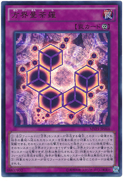 (1): 我方場上有「方界」之名的怪獸存在的場合,以任意體此回合被破壞並送入墓地的對手怪獸才能發動此卡。 該怪獸的攻擊力變為0並在對手場上特殊召喚,給該怪獸搭載1個方界計數器。 搭載方界計數器的怪獸不能攻擊,效果無效化。 (2): 對象怪獸於對手場上存在為限,對手怪獸的效果的發動無效化。 (3): 所有對象怪獸離場的場合此卡破壞。