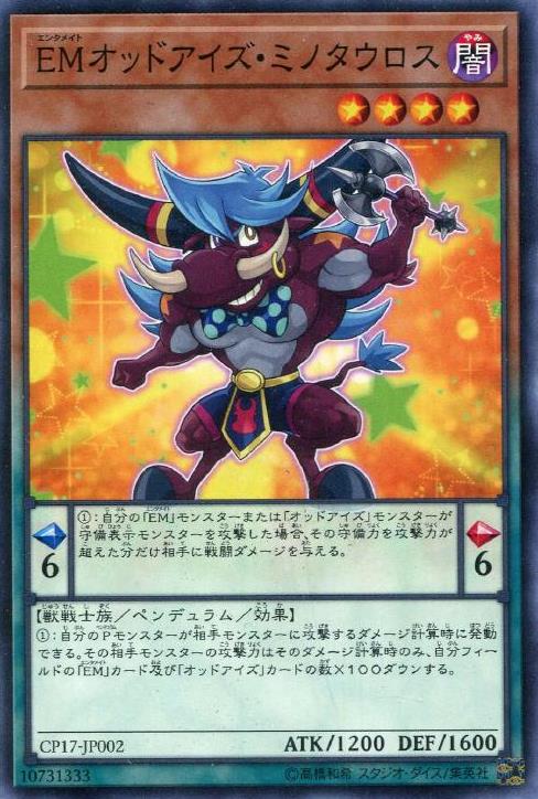 擺動刻度:左6右6擺動效果:我方的「EM」或是「異色眼」之名的怪獸向守備表示怪獸進行攻擊的場合,給予對手該攻擊力超過守備力數值的戰鬥傷害。怪獸效果:我方的擺動怪獸向對手怪獸進行攻擊的傷害計算時可以發動。僅在該次傷害計算時該對手怪獸的攻擊力下降我方場上的「EM」以及「異色眼」之名的卡片數量×100。