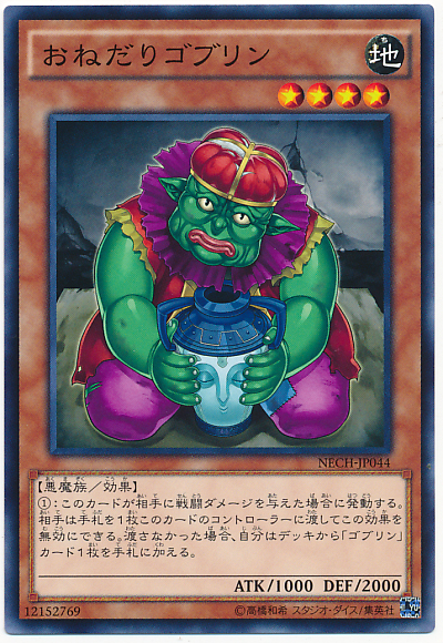 此卡給予對方戰鬥傷害時發動。對方可以轉移自己1張手札的控制權使此卡以下的效果無效。否則從我方牌組將1張「哥布林」之名的卡片加入手札。