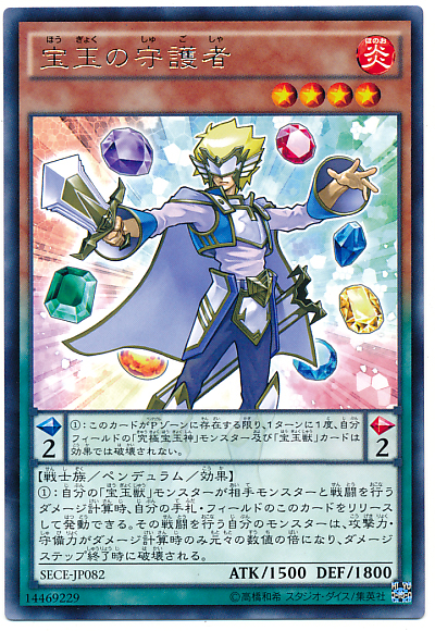 擺動刻度:左2右2 擺動效果: 此卡於擺動區域存在為限,1回合1次,我方場上所有「究極寶玉神」之名的怪獸以及「寶玉獸」之名的卡片不會被卡片效果破壞。 怪獸效果: 我方的「寶玉獸」之名的怪獸和對手怪獸進行戰鬥的傷害計算時,可以解放手札、場上的此卡發動。 在傷害計算時該進行戰鬥的我方怪獸的攻擊力、守備力變為原數值的2倍、傷害步驟結束時破壞。