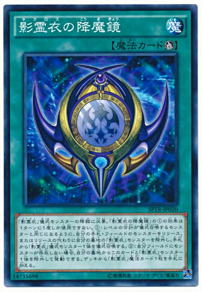 (2)我方主要階段時,若我方場上不存在怪獸,可以移除從我方墓地此卡和1體「影靈衣」之名的怪獸來發動。從我方牌組將1張「影靈衣」之名的魔法卡加入手札。