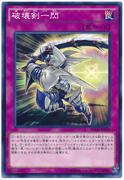 (1): 我方場上有需以「龍破壞之劍士」作為素材的融合怪獸存在的場合才能發動。 對手場上所有怪獸除外。 (2): 以我方場上的「龍破壞之劍士」之名的怪獸作為對象的魔法、陷阱、怪獸效果發動時,可以將墓地的此卡除外發動。 該效果無效並破壞。