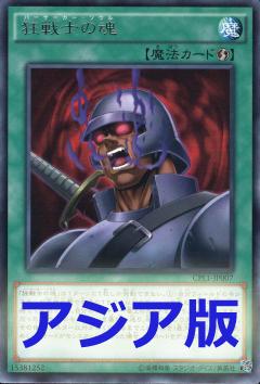 我方怪獸直接攻擊給予對方1500分以下的戰鬥傷害時,可以將我方手札全部捨棄來發動。從我方的牌組最上方翻牌,若翻到的卡片是怪獸卡,則將該怪獸送入墓地,給予對方500分傷害,之後重複此動作最多7次直到翻到怪獸卡以外的卡片為止,若翻到的卡片是怪獸卡以外的卡片,則此卡回到牌組最上方。「狂戰士之魂」1回合只能發動1張。