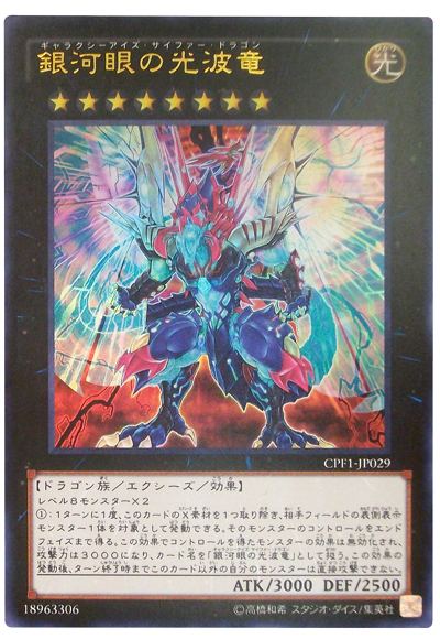 等級8怪獸×2 1回合1次,可以移除此卡的1個超量素材,以對手場上1體表側表示怪獸為對象發動。 到結束階段以前得到該怪獸的控制權。 以此效果得到控制權的怪獸的效果無效化,攻擊力變為3000,卡名視為「銀河眼光波龍」。 發動此效果以後,到回合結束以前我方除此卡以外的怪獸不能直接攻擊。