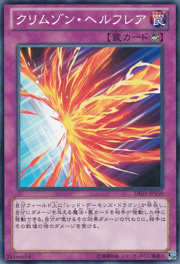 若我方場上表側表示存在「紅惡魔龍」,對方發動確定會給予我方效果傷害的魔法.陷阱卡時可以緊接連鎖其後發動。我方受到的傷害要由對方來代替承受與此傷害的2倍相等的數值。