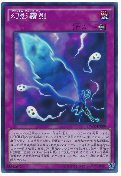以場上1體效果怪獸為對象才能發動此卡。 「幻影霧劍」的(1)(2)效果1回合僅能各使用1次。 (1): 此卡於魔法&陷阱區域存在為限,對象怪獸不能攻擊,不會成為攻擊對象,效果無效化。 該怪獸離場時此卡破壞。 (2): 可以將墓地的此卡除外,以我方墓地1體「幻影騎士團」之名的怪獸為對象發動。 該怪獸特殊召喚。 以此效果特殊召喚的怪獸離場的場合除外。