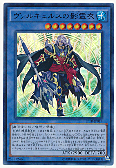 此卡不能通常召喚。以「影靈衣」之名的儀式魔法卡的效果來儀式召喚。此卡僅能以儀式召喚方式特殊召喚。儀式召喚此卡時,只能解放等級8以外的怪獸當作素材。「瓦爾裘路斯的影靈衣」的(1)(2)效果1回合只能各自發動1次。
