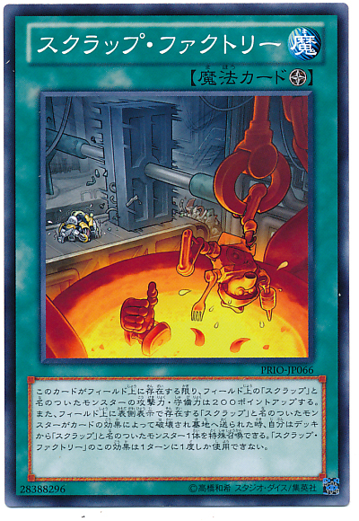 此卡表側表示存在為限,場上表側表示「廢鐵」之名的怪獸攻擊力.守備力上升200分。傷害步驟以外,場上「廢鐵」之名的怪獸被效果破壞送入墓地時可以發動。從我方牌組特殊召喚1體「廢鐵」之名的怪獸。「廢鐵工廠」的效果1回合只能發動1次。