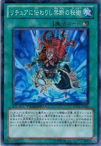 從我方手札選1體「咒法」之名的儀式怪獸,解放我方.對方場上等級合計與該儀式怪獸等級相同的怪獸。之後從我方手札儀式召喚特殊召喚該1體「咒法」之名的儀式怪獸。此效果儀式召喚的怪獸的攻擊力變成一半。此卡發動的回合,我方不能進入戰鬥階段。
