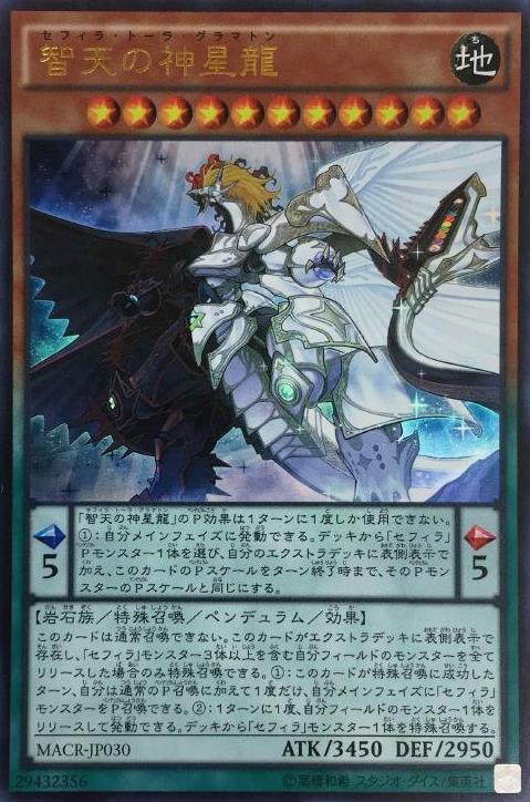 擺動刻度:左5右5擺動效果:「智天之神星龍」的擺動效果1回合僅能使用1次。我方的主要階段時可以發動。從牌組選擇1體「天球」之名的擺動怪獸以表側表示加入我方額外牌組。到回合結束以前此卡的擺動刻度變為該怪獸的擺動刻度相同。怪獸效果:此卡不能通常召喚。此卡於額外牌組以表側表示存在,解放我方場上包含3體以上的「天球」之名的怪獸的所有怪獸才能特殊召喚。(1):此卡特殊召喚成功的回合,我方在通常的擺動召喚追加1次,可以在我方的主要階段時將「天球」之名的怪獸擺動召喚。(2):1回合1次,可以解放我方場上1體怪獸發動。從牌組將1體「天球」之名的怪獸特殊召喚。※此卡具「天球」之名。