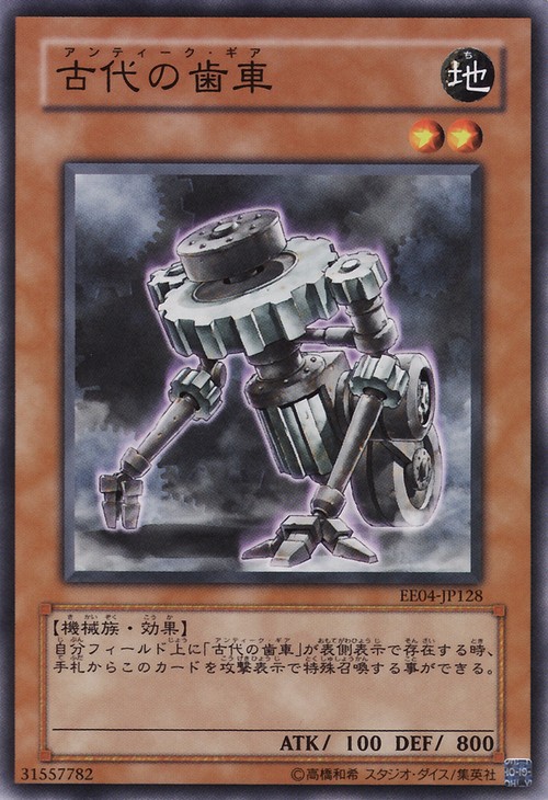 我方場上表側表示存在「古代的齒車」時。可以從手札以攻擊表示特殊召喚此卡。 此卡具有「古代的機械」之名