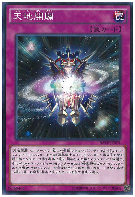 「天地開闢」1回合僅能發動1張。從牌組將包含1體以上的「混沌士兵」或是「暗黑騎士蓋亞」之名的怪獸的3體戰士族怪獸給對手確認,對手隨機選擇其中1張。若是「混沌士兵」或是「暗黑騎士蓋亞」之名的怪獸的場合,該怪獸加入手札,其餘卡片送入墓地。不是的場合,給對手確認的所有卡片送入墓地。