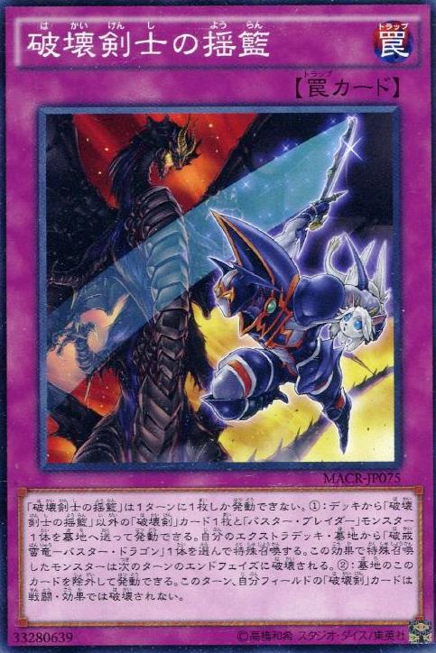 「破壞劍士的搖籃」1回合僅能發動1張。(1):從牌組將1張「破壞劍士的搖籃」以外的「破壞劍」之名的卡片以及1體「龍破壞之劍士」之名的怪獸送入墓地才能發動。從我方額外牌組、墓地選擇1體「破戒蠻龍-巴斯達多拉格」特殊召喚。以此效果特殊召喚的怪獸在下個回合的結束階段時破壞。(2):可以將墓地的此卡除外發動。此回合,我方場上所有「破壞劍」之名的卡片不會被戰鬥、卡片效果破壞。