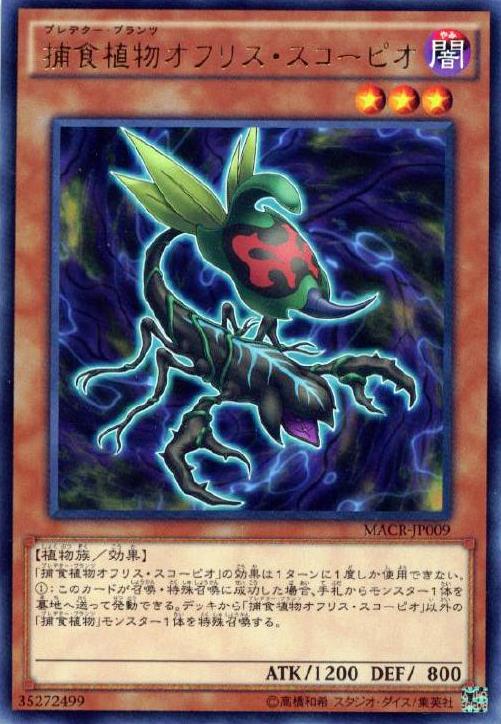 「捕食植物蜂蘭蠍」的效果1回合僅能使用1次。此卡召喚、特殊召喚成功的場合,可以從手札將1體怪獸送入墓地發動。從牌組將1體「捕食植物蜂蘭蠍」以外的「捕食植物」之名的怪獸特殊召喚。
