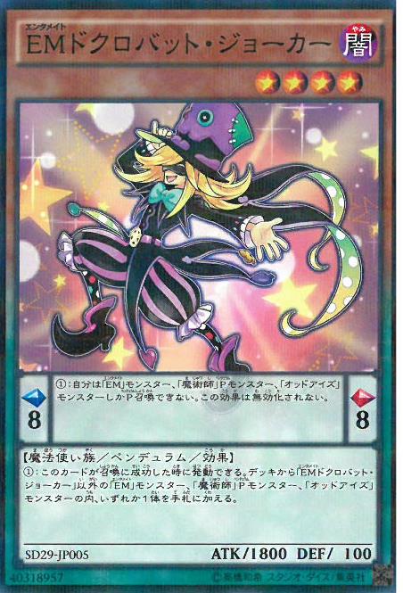 擺動刻度:左8右8 擺動效果: 我方僅能擺動召喚「EM」之名的怪獸、「魔術師」之名的擺動怪獸、「異色眼」之名的怪獸。 此效果不會被無效化。 怪獸效果: 此卡召喚成功時可以發動。 從牌組的「EM」之名的怪獸、「魔術師」之名的擺動怪獸、「異色眼」之名的怪獸之中選擇1張「EM骷髏蝙蝠小丑」以外的卡片加入手札。