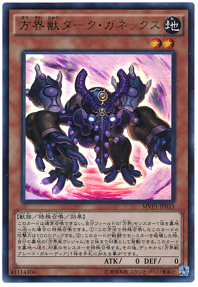 此卡不能通常召喚。 可以從我方場上將1體「方界」之名的怪獸送入墓地特殊召喚。 (1): 以此方法特殊召喚的此卡的攻擊力上升1000。 (2): 此卡戰鬥破壞怪獸時,可以我方墓地2體「方界胤毗濕奴」為對象發動。 此卡送入墓地,對象怪獸特殊召喚。 之後,從牌組將1體「方界獸刀刃迦樓羅」加入手札。