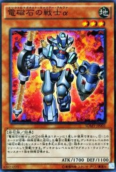 「電磁石戰士α」的(1)效果1回合僅能使用1次。<br/>(1):<br/>此卡召喚、特殊召喚成功的場合可以發動。<br/>從牌組將1體等級8的「磁石戰士」之名的怪獸加入手札。<br/>(2):<br/>對手回合時可以解放此卡發動。<br/>從牌組將1體等級4的「磁石戰士」之名的怪獸特殊召喚。