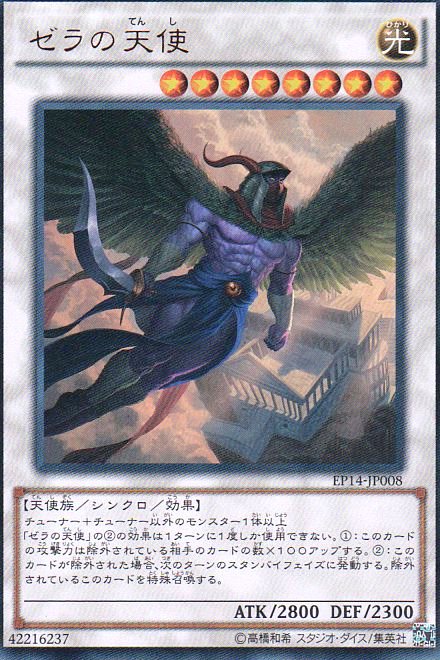 協調+協調以外的怪獸1體以上 「傑拉的天使」的(2)效果1回合只能發動1次。 (1)此卡的攻擊力上升對方被移除的卡片數量x100分。 (2)若此卡被移除,下回合的準備階段時若此卡沒有離開過移除區則發動。從移除區特殊召喚此卡。
