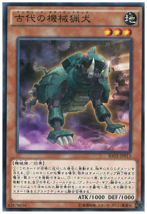 (1):此卡召喚成功的場合發動。給予對手600分傷害。(2):此卡進行攻擊的場合,到傷害步驟結束以前對手不能發動魔法、陷阱卡。(3):1回合1次,我方的主要階段時可以發動。從我方手札、場上將「古代的機械」之名的融合怪獸卡上決定的融合素材怪獸送入墓地,從額外牌組將該1體融合怪獸融合召喚。