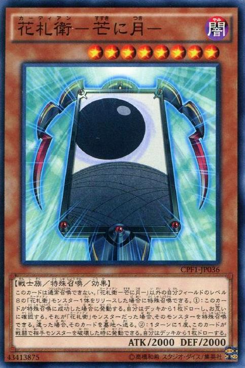 此卡不能通常召喚。 可以解放我方場上1體除「花札衛-桐上鳳凰-」以外的等級12的「花札衛」之名的怪獸特殊召喚。 (1): 此卡特殊召喚成功的場合發動。 從牌組抽1張牌。 該卡片是「花札衛」之名的怪獸的場合,該怪獸特殊召喚。 不是的場合,該卡片送入墓地。 (2): 1回合1次,此卡給予對手戰鬥傷害時可以發動。 從牌組抽1張牌。