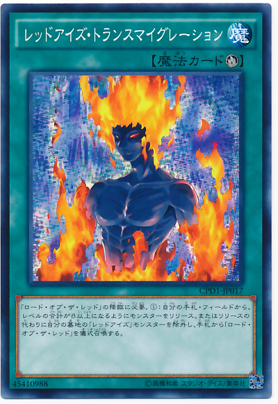 「真紅領王」降臨必需。 從我方手札、場上將合計等級8以上的怪獸解放,或是從我方墓地將「真紅眼」之名的怪獸除外代替解放,從手札將「真紅領王」儀式召喚。