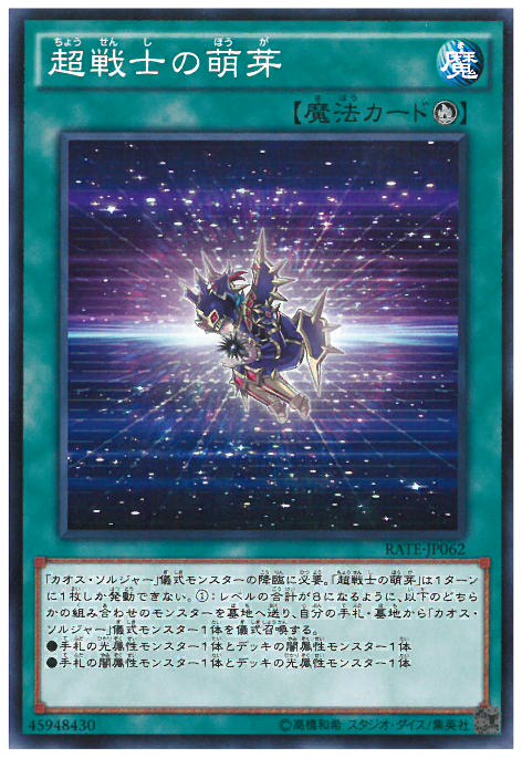 「混沌士兵」之名的儀式怪獸降臨必需。「超戰士的萌芽」1回合僅能發動1張。從以下1種組合中將等級合計8的怪獸送入墓地,從我方手札、墓地將1體「混沌士兵」之名的儀式怪獸儀式召喚。●手札的1體光屬性怪獸以及牌組的1體闇屬性怪獸●手札的1體闇屬性怪獸以及牌組的1體光屬性怪獸
