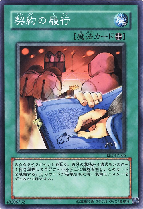支付 800 點生命。從自己墓地裡選擇一隻儀式怪獸,將之特殊召喚到自己的場上並裝備此卡。當此卡被破壞時,將裝備此卡的怪獸移出遊戲。