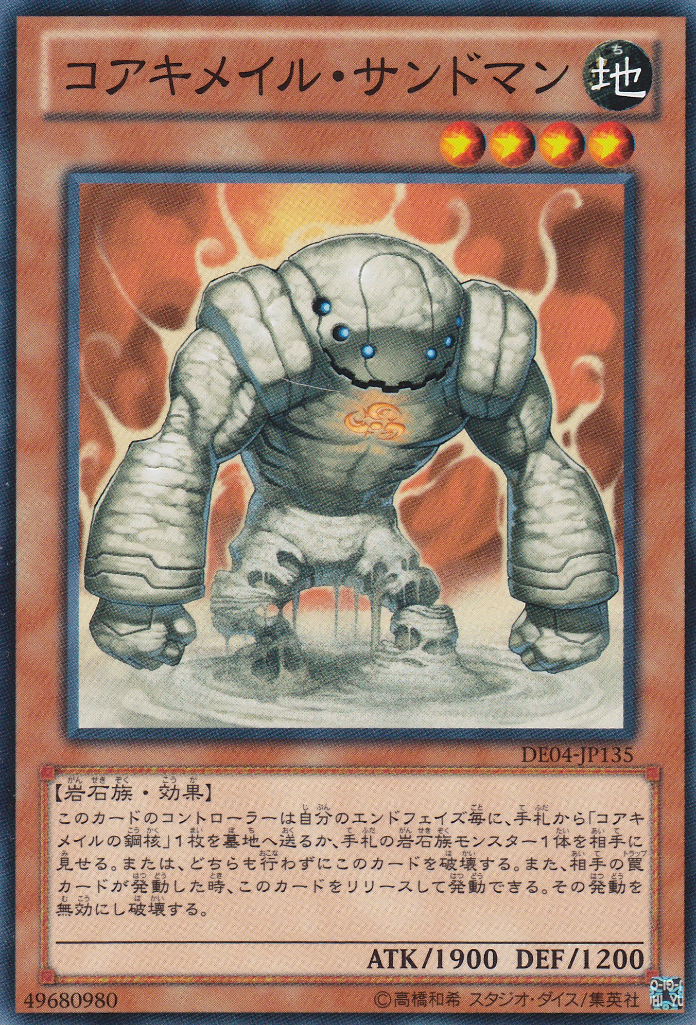 每次我方結束階段時將手札1張「核成的鋼核」送入墓地或公開手札1張岩石族怪獸,或都不做讓此卡破壞。對方發動陷阱卡時,可以解放此卡來發動。該發動無效並破壞。