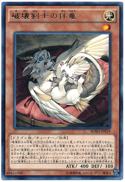 此卡於墓地存在,我方場上有「龍破壞之劍士」存在的場合,可以捨棄手札1張「破壞劍」之名的卡片發動。