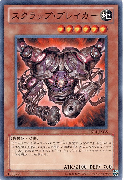 若對方場上存在怪獸,可以從手札特殊召喚此卡。此方法特殊召喚成功時,選擇我方場上表側表示存在的1體「廢鐵」之名的怪獸來發動。選擇的怪獸破壞。