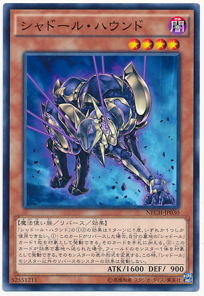「影依獵犬」的(1)(2)效果1回合1次只能選擇其中1個發動。 (1)反轉:此卡反轉的場合,可以選擇我方墓地1張「影依」之名的卡片來發動。選擇的卡片加入手札。 (2)此卡被卡片效果送入墓地的場合,可以選擇場上1體怪獸來發動。選擇的怪獸變更表示形式。此時,「影依」之名的怪獸以外的反轉怪獸的效果不發動。(反轉怪獸以外的怪獸在反轉時的誘發效果不在此限)