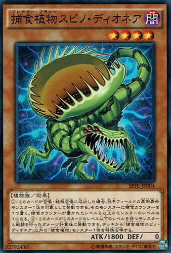 (1):此卡召喚、特殊召喚成功的場合,可以對手場上1體表側表示怪獸為對象發動。給該怪獸搭載1個捕食計數器。搭載捕食計數器且等級2以上的怪獸的等級變為1。(2):此卡和等級在此卡以下的怪獸進行戰鬥的傷害計算以後可以發動。從牌組將1體「捕食植物捕蠅草棘龍」以外的「捕食植物」之名的怪獸特殊召喚。