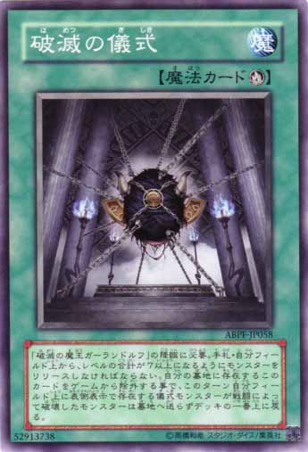 解放我方手札.場上等級合計7以上的怪獸。之後從我方手札儀式召喚特殊召喚1體「破滅的魔王加蘭多路夫」。我方主要階段時,可以移除我方墓地的此卡來發動。此回合我方場上表側表示的儀式怪獸戰鬥破壞的怪獸不送入墓地而改成回到牌組最上方。