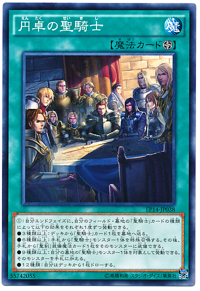 我方結束階段時,根據我方場上.墓地的「聖騎士」之名的卡片種類可以各自發動以下效果1次。 ●3種以上:從我方牌組將1張「聖騎士」之名的卡片送入墓地。 ●6種以上:從我方手札特殊召喚1體「聖騎士」之名的怪獸。之後,可以從我方手札將1張「聖劍」之名的裝備魔法卡裝備在該特殊召喚怪獸上。 ●9種以上:選擇我方墓地1體「聖騎士」之名的怪獸來發動。選擇的怪獸加入手札。 ●12種類:我方抽1張牌。