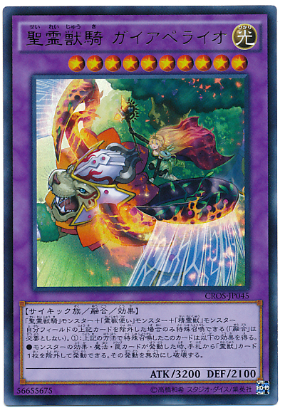 「聖靈獸騎」之名的怪獸+「靈獸使」之名的怪獸+「精靈獸」之名的怪獸 此卡僅能將我方場上存在的上述卡片移除當作條件特殊召喚(不使用「融合」魔法卡)。以上述方式特殊召喚的此卡得到以下效果。 ●效果怪獸的效果.魔法.陷阱卡發動時,可以移除我方手札1張「靈獸」之名的卡片來發動。該發動無效並破壞。