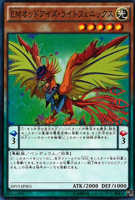 擺動刻度:左3右3 擺動效果: 我方另一邊的擺動區域有卡片存在的場合,對手怪獸的直接攻擊宣言時可以發動。 我方另一邊的擺動區域的卡片破壞,此卡特殊召喚。 怪獸效果: 可以解放此卡,以我方場上1體「EM」之名的怪獸為對象發動。 到回合結束以前該怪獸的攻擊力上升1000。 此效果也可以在對手回合發動。