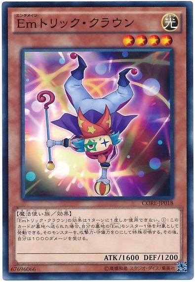 「Em魔術小丑」的效果1回合僅能使用1次。 此卡被送入墓地的場合,可以我方墓地1體「Em」之名的怪獸為對象發動。 該怪獸攻擊力、守備力變為0特殊召喚。 之後,我方受到1000分傷害。