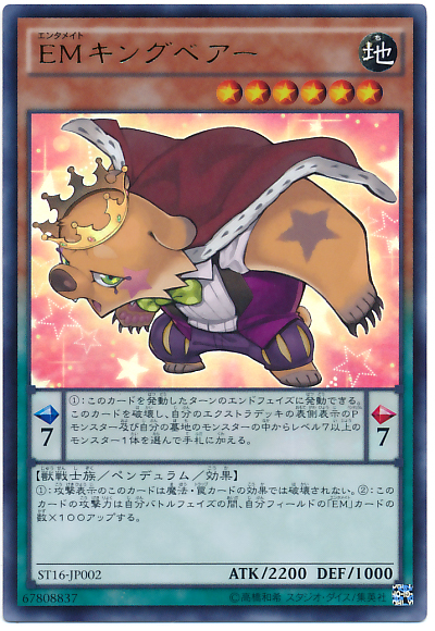 擺動刻度:左7右7 擺動效果: 發動此卡的回合的結束階段時可以發動。 從我方額外牌組表側表示的擺動怪獸以及我方墓地的怪獸之中選擇1體等級7以上的怪獸加入手札。 怪獸效果: (1): 表側攻擊表示的此卡不會被魔法、陷阱卡的效果破壞。 (2): 我方的戰鬥階段時此卡的攻擊力上升我方場上的「EM」之名的卡片數量×100。