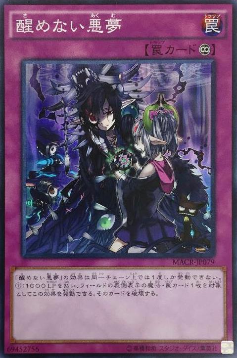 「不醒的噩夢」的效果在同一連鎖上僅能發動1次。支付1000分生命值,以場上1張表側表示的魔法、陷阱卡為對象才能發動此效果。該卡片破壞。