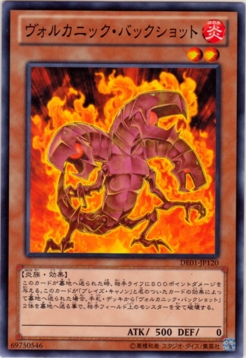 此卡被送入墓地時發動。給予對方500分傷害。此卡被「火炎加農砲」之名的卡片效果送入墓地的場合,可以將我方手札.牌組把2體「火山鹿彈」送入墓地來發動。對方場上的怪獸全部破壞。(此時此卡的第1效果作連鎖1,等待對方該時間的強制誘發效果發動後,此卡的第2效果連鎖在其之後發動。)