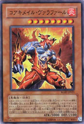 每次我方結束階段時將手札1張「核成的鋼核」送入墓地,或讓此卡破壞。此卡可以只解放1體「核成」之名的怪獸來升級召喚。此卡表側表示存在場上為限,此卡攻擊守備表示怪獸時,攻擊力若超過守備表示怪獸的守備力,該數值差距則給予對方戰鬥傷害,此卡不會被陷阱卡效果破壞。