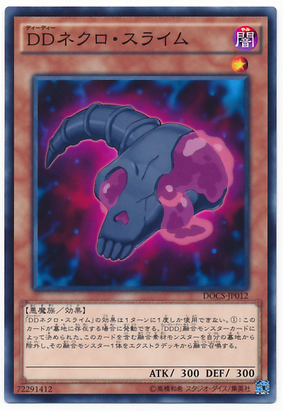 「DD死靈史萊姆」的效果1回合僅能使用1次。 此卡於墓地存在的場合可以發動。 從我方墓地將包含此卡的「DDD」之名的融合怪獸卡決定的融合素材怪獸除外,從額外牌組將該1體融合怪獸融合召喚。