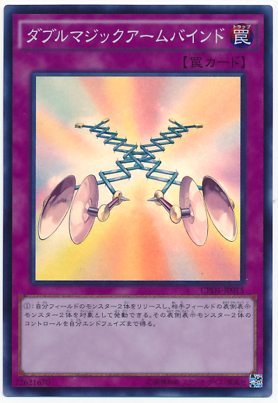 解放我方場上2體怪獸,以對手場上2體表側表示怪獸為對象才能發動。 到我方的結束階段以前得到該2體表側表示怪獸的控制權。