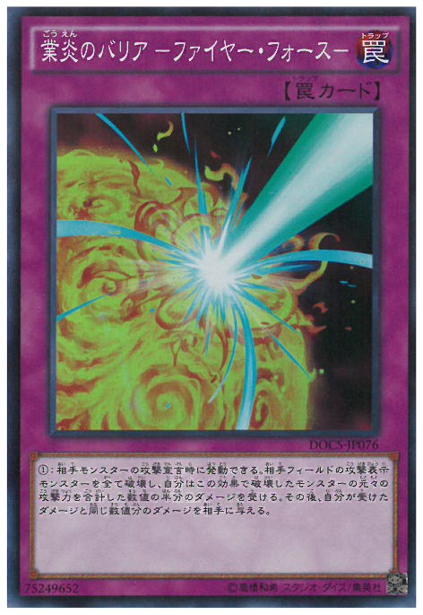 對手怪獸的攻擊宣言時才能發動。 對手場上所有攻擊表示怪獸破壞,我方受到以此效果破壞的怪獸的攻擊力總和一半數值的傷害。 之後,給予對手和我方受到的傷害數值相同數值的傷害。