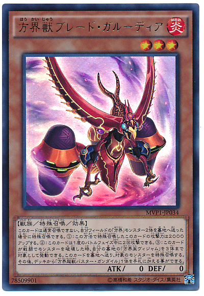 此卡不能通常召喚。 可以從我方場上將2體「方界」之名的怪獸送入墓地特殊召喚。 (1): 以此方法特殊召喚的此卡的攻擊力上升2000。 (2): 此卡可以在1次戰鬥階段中進行2次攻擊。 (3): 此卡戰鬥破壞怪獸時,可以我方墓地最多2體「方界胤毗濕奴」為對象發動。 此卡送入墓地,對象怪獸特殊召喚。 之後,從牌組將1體「方界超獸爆裂健馱邏」加入手札。