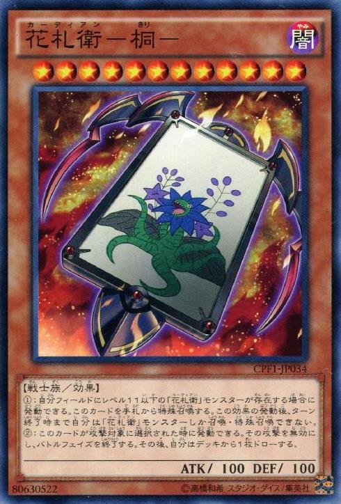 此卡不能通常召喚。 可以解放我方場上1體除「花札衛-芒上月-」以外的等級8的「花札衛」之名的怪獸特殊召喚。 (1): 此卡特殊召喚成功的場合發動。 從牌組抽1張牌。 該卡片是「花札衛」之名的怪獸的場合,該怪獸特殊召喚。 不是的場合,該卡片送入墓地。 (2): 1回合1次,此卡戰鬥破壞對手怪獸時可以發動。 從牌組抽1張牌。